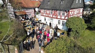 Pünktlich um 15:00 Uhr begrüßten die Bembelsänger die vielen Gäste mit "Hallo Ihr Leut". Das griff Herr Bürgermeister Jan Kraus in seiner anschließenden Eröffnungsrede dann auch auf und begann ebenfalls mit "Hallo Ihr Leut, herzlich willkommen!". Er begrüßte insbesondere Pfarrer Tim Fink, als Repräsentant der evangelischen Kirchengemeinde, die der Gemeinde Hünstetten das Pfarrhaus vermietet hat. Ebenso den ehemaligen Pfarrer Hans Hamrich und seine Frau Birgit, die es sich nicht nehmen ließen zur Eröffnung zu kommen, um zu sehen, was aus ihrem ehemaligen Wohnhaus geworden ist. Und auch der Ehrenortsvorsteher des Ortsteils Wallbach, Volker Denzer, war da und Herr Kraus führte aus, dass er gemeinsam vor vielen Jahren mit Herrn Denzer, damals noch als Gemeindevertreter, ein Heimatmuseum für Hünstetten beantragt hatte. Herr Kraus wandte sich dann mit einem Dankeschön an das ehrenamtlich tätige Museumsteam und schilderte kurz, was in den aktuellen Ausstellungen "Spuren der Vergangenheit; Zeugnisse 1914-1945", "Geschichte der Hünstetter Schulen", "Kindheit auf dem Dorf", "Schiefer / Burg Hünstetten-Wallrabenstein und Graf Walram" sowie "Michelsberger Steinzeitkultur" zu sehen und entdecken ist. Herr Kraus betonte in seinem Grußwort, dass das Heimatmuseum Hünstetten ein Ort der Begegnung für Jung und Alt sein wird und mit wechselnden zusätzlichen Angeboten einmal im Monat zu Kaffee und Kuchen und einmal zu einem gemütlichen Beisammensein "Abends im Museum" einladen wird. Der reguläre Öffnungstermin des Museum ist ab Mai 2025 immer der 3. Sonntag im Monat von 15:00 Uhr bis 18:00 Uhr. Zum Abschluss seiner Ansprache bat Herr Kraus, die vielen Gäste mit ihm und dem Museumsteam gemeinsam auf die Eröffnung des Museums mit einem Glas Sekt anzustoßen und schnitt danach das rote Band an der Haustür des Pfarrhauses gemeinsam mit der Bechtheimer Ortsvorsteherin Frauke Dietz durch. Nun begann ein fröhliches "Gewusel". Die Einen holten sich selbstgebackenen Kuchen und Kaffee vom Buffet, die Anderen wollten zuerst mal einen Blick in das Pfarrhaus werfen und schauen, was es dort zusehen und entdecken gab. Schnell füllte sich dann auch der österlich dekorierte Aufenthaltsraum im Museum. Immer wieder war zu hören: "Schön ist es hier. Wir kommen ganz bestimmt wieder!" Im Laufe des Nachmittags gab es auch noch ein Geschenk für das Heimatmuseum Hünstetten. Der Museumsverein "EINST UND JETZT e.V." aus der Nachbargemeinde Hünfelden überreichte das Buch "KIRBERG - EINST UND JETZT" und würde sich über einen zukünftigen Austausch zur Museumsarbeit freuen. Das Museumsteam bedankt sich herzlich.