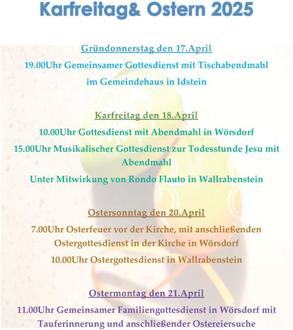 | 7:00 Uhr | Osterfeuer vor der Kirche, mit anschließenden Ostergottesdienst in der Kirche in Wörsdorf |