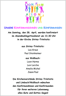 | 13.30 Uhr | Konfirmationsgottesdienst in der Ev. Kirche Strinz-Trinitatis |
