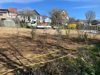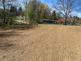 Der noch freie, unbearbeitete Bereich hinter der neuen Kita in Beuerbach wurde bepflanzt und eingesät.