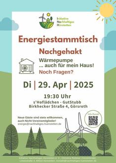 Unser zwölfter INaH-Stammtisch richtet sich an alle, die mit dem Gedanken spielen, ihre alte Heizung irgendwann vielleicht durch eine Wärmepumpe zu ersetzen. Auch Nicht-Vereinsmitglieder sind stets willkommen: am Dienstag, 29. April, um 19:30 Uhr in der GutStubb (s’Hoflädchen), Birkheckerstraße 4 in Görsroth.