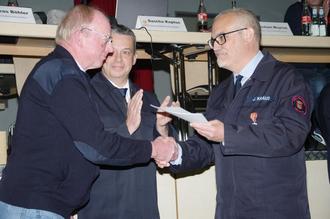 Insgesamt elf Kameraden erhalten für langjährige Mitgliedschaften eine Anerkennungsprämie, darunter Michael Friedel für 40 und Dieter Gorniak für 50 Jahre.