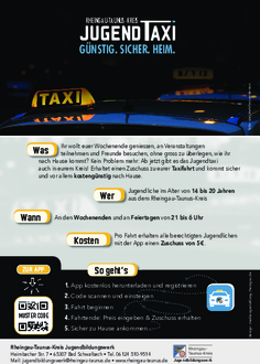 Infos zur App (Android / iOS) sowie die Bedingungen findet Ihr auf der Seite vom Rheingau-Taunus-Kreis (Suchbegriff „Jugendtaxi“ eingeben) oder hier über den QR Code:
