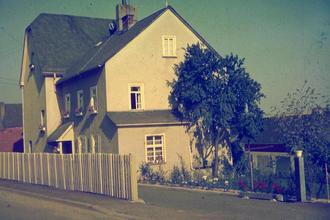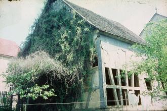 Die 2005 abgebrochene Beuerbacher Schule, rechts das Lehrerwohnhaus aus dem Jahr 1820, links der Schulbau aus dem Jahr 1912