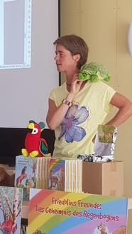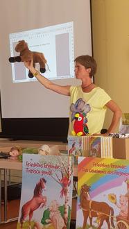 Frau Julia Morgenthaler, eine Kinderbuchautorin aus Hofheim und langjährige ZDF-Redakteurin stellte den Kindern ihr Buchprojekt „Friedolins Freunde“ vor. In diesen 2 Büchern begegnen den Kindern ganz unterschiedliche Tiere mit ihren ganz eigenen besonderen Charakteren: Friedolin, das verträumte Schaf/ Lora, der schräge Vogel / Picky Pig, das quirlige Schwein/Pieps, die abenteuerlustige Maus,/Karla, die weise Schildkröte und Harry the Horse, das mutige Pferd
