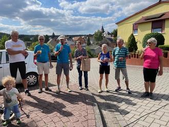 Sportler, die von Anfang an dabei waren: v.l.n.r.: Gregor Klumpp, Rainer Engel, Wolfgang Weber (OV’in Frauke Dietz überreicht Fitness-Brote), Inge Toldrian, Dieter Schneider und Monika Engel. Vorn links zum ersten Mal dabei Adam Weber als Glücksbringer.