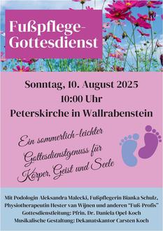 | 10:00 Uhr | Unterwegs auf den eigenen Füßen - Wallrabenstein – Pfrin. Dr. Daniela Opel-KochWohlfühl-Gottesdienst mit Podologin Alexandra Malecki u. a. „Fuß“-Profis |