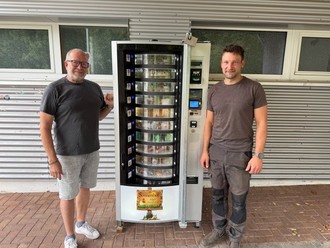 Neu ist nicht nur das Angebot, sondern auch der Standort: Damit der Automat besser vor Wind und Wetter geschützt ist, wurde er nun um die Ecke unter dem Vordach aufgestellt – gut erreichbar und gleichzeitig gut geschützt.