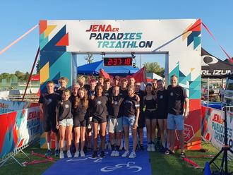 Limbach/Jena. Die Deutsche Triathlonjugend sucht zum wiederholten Mal ihre Meister*innen beim Jenaer Paradiestriathlon. Bestes Wetter und hervorragende Organisation sorgen an beiden Wettbewerbstagen für faire und ansprechende Rennen. Mit dem Einzug der Triathleten aller 16 Landesverbände beginnt die DM bereits freitags. Der Wallbacher Tom Borst erhält die Ehre, darf bei der Zeremonie die hessische Fahne tragen und die hessische Vertretung anführen. Im Planetarium der Stadt erwartet die Sportler*innen eine einzigartige Eröffnungsfeier mit toller Lichtshow. Eine einmalige und bestimmt bleibende Erinnerung.