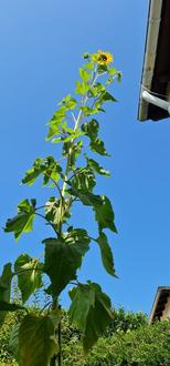Diese wunderschöne Sonnenblume steht in Beuerbach auf der Terrasse von Familie Czerr. Sie wächst inmitten von Rose, Lavendel, Zitronengeranie in einem großen Kübel, hat mittlerweile eine stattliche Höhe von 3,30 m erreicht und bisher eine große geöffnete Blüte sowie weitere 8 Knospen, die sicher bald auch blühen werden....