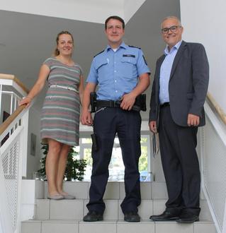 v.l.n.r. Stv. Fachbereichsleiterin Ordnungsamt Anja Faulhaber, Schutzmann und Polizeihauptkommissar Fabian Boll mit Bürgermeister Jan Kraus