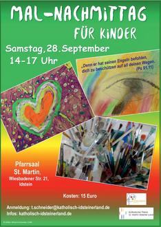 Am 28. September veranstaltet die Katholische Pfarrei St. Martin Idsteiner Land in Kooperation mit dem Kinderatelier Fuentes im Pfarrsaal von St. Martin, Idstein, einen Malnachmittag für Kinder zwischen sechs und zehn Jahren. In der Zeit von 14 bis 17 Uhr entstehen Bilder, die sich mit dem Psalm 91,11 aus der „Denn er hat seinen Engeln befohlen, dich zu beschützen auf all deinen Wegen.“ beschäftigen.
