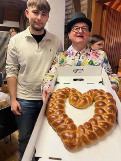 Einige Kinder haben gleich mehrere Brezeln gewonnen und präsentieren sie stolz. Zum Abschluss würfeln alle Tischsieger um die 1 kg Herz-Brezel. Mark Philip Miloszawski aus Nieder-Ohmen im fernen Vogelsberg ist der diesjährige Gewinner.