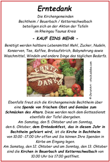 | 10.00 Uhr | Erntedank-Gottesdienst in der Ev. Kirche Bechtheim |