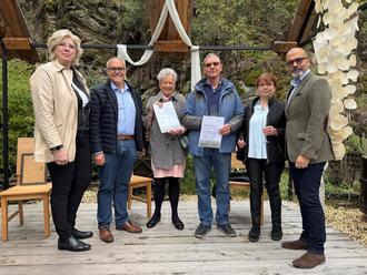 v.l.n.r.: Bürgermeisterin der Gemeinde Aarbergen Marion Janßen, Bürgermeister Jan Kraus, Christina Redeker (Vorstand Initiative für Nachhaltigkeit Hünstetten e. V.); Dr. Christoph Labude und Birgit Raschtuttis vom Verein(t) Wallrabenstein e. V. mit Staatssekretär vom Hessischen Ministerium für Landwirtschaft und Umwelt, Weinbau, Forsten, Jagd und Heimat - Daniel Köfer.