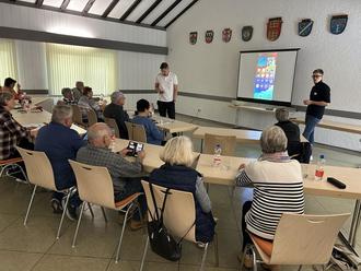 Am 05. Oktober war es dann soweit. 19 wissbegierige Senioren folgten der Einladung ins DGH Kesselbach. Nach einer kurzen Begrüßung starten die beiden DI@Lotsen Thomas und Sergej mit dem „Unterricht“. Abwechselnd wurden zunächst die Themen für Android und anschließend für iPhone erläutert. Mittels eines Beamers wurde der jeweilige Bildschirm an der Leinwand gezeigt, sodass die Teilnehmer sehen konnten, was genau auf dem Smartphone gedrückt wurde. Anschließend sollte jeder an seinem eigenen Smartphone das Gezeigte wiederholen. Hierbei unterstützten Angela, Harry, Sandra und Sven von der Ehrenamtsagentur jeden Teilnehmer bei Fragen.