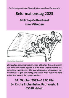 | 18.00 Uhr | Gottesdienst zum Mitreden in der Ev. Kirche Eschenhahn |