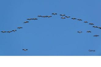 Kraniche fliegen in sogenannten Ketten, die meist V-förmig sind, aber immer etwas schiefwinklig aussehen. Diese Form hilft dem einzelnen Vogel im Windschatten des Vordermanns zu fliegen und dadurch Energie zu sparen. Die Plätze werden immer gewechselt, so dass jedes Tier mal ausruhen kann. Es gibt auch keinen Leitvogel, sondern erwachsene und erfahrene Tiere wechseln sich an der Spitze ab. Innerhalb der Kette verständigt man sich durch das sogenannte Trompeten.