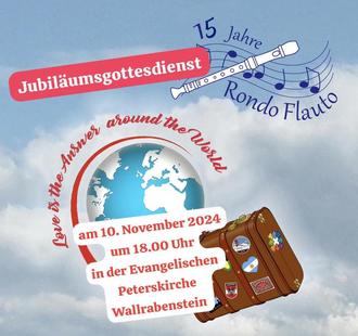 | 18.00 Uhr | Abend-Gottesdienst zum 15jährigen Jubiläum von Rondo Flauto mit anschließendem Zusammensein in Wallrabenstein |
