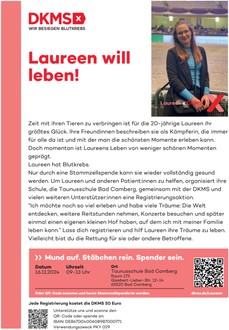Typisierung geht schnell und schmerzlos – jedoch für viele Betroffene die einzige Chance auf Heilung. „Selbst wenn kein Spender für mich gefunden wird, dann vielleicht für jemand anderen“, sagt Laureen. Die Schule ist erst einmal kein Thema mehr im Alltag, das Abitur im nächsten Frühjahr nicht zu schaffen. Nach einer Stammzellentransplantation brauchen die meisten Patienten bis zu einem Jahr, um wieder auf die Beine zu kommen. Dass es so lange dauert, beschäftigt Laureen sehr. Nach den vielen Arztbesuchen, Krankenhausaufenthalten, Chemotherapie und Bestrahlung wartet die 20-Jährige jetzt ungeduldig auf einen passenden Spender. Sie möchte wieder zurück an die Schule, ihr Abitur machen. Selbst Präsentationen und Referate haben für die schüchterne junge Frau jetzt ihren Schrecken verloren. „Ich vermisse die normalsten Dinge: Auto fahren, in die Schule gehen, meine Tiere versorgen.“ Kraft geben ihr ihre drei Hunde und ihr Pferd Roco. Bedenkenlos kuscheln darf sie mit ihren Tieren aber auch nicht – die Infektionsgefahr ist zu groß.