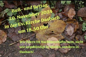 | 18.30 Uhr | Gemeinsamer Gottesdienst zum Buß-und Bettag in der Ev. Kirche in Dasbach |