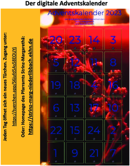 Bereits in den vergangenen Jahren haben täglich viele Menschen gespannt die Türchen unseres „digitalen Adventskalenders“ geöffnet, um zu schauen, was sich dahinter verbarg. Auch in diesem Jahr öffnet sich an jedem Tag wieder eine neue Tür. Dahinter liegt eine Menge an Geschichten, Impulsen, Gedichten, mal lustig, mal nachdenklich, und eine Menge an Musik, mal klassisch, mal eher rockig, als kurze Youtube-Videos (3 bis 10 Minuten) mit eindrücklichen Bildern gestaltet. Stolz sind wir darauf, dass alle Beiträge dieses Kalenders in unseren Ortschaften entstanden sind oder Menschen aus unseren Orten daran mitgewirkt haben!