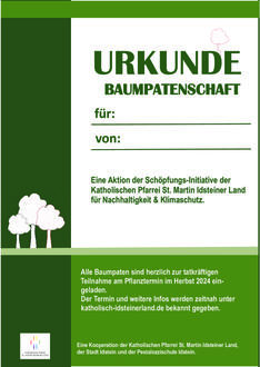 Durch den Erwerb von Baumpatenschaften beteiligt sich der Pate an dieser Aktion der Schöpfungs-Initiative der Pfarrei und unterstützt dadurch die Neupflanzung von Bäumen in einem Waldstück zwischen Idstein und Esch.