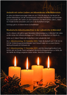 - Am 23. Dezember, Sa. vor dem 4. Advent, laden wir Sie um 17.00 Uhr zu einer Andacht mit Lieder singen am Adventskranz in Wallrabenstein ein.