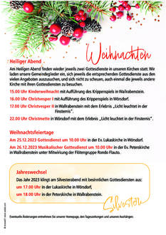 | 10.00 Uhr | Musikalischer Weihnachtsgottesdienst unter Mitwirkung der Flötengruppe Rondo Flauto in Wallrabenstein |