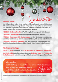 | 17.00 Uhr | Gottesdienst zum Jahresabschluss in Wörsdorf |