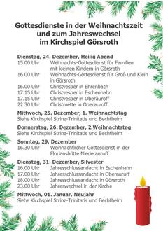 | 16.00 Uhr | Gottesdienst mit Weihnachtsspiel in der Ev. Kirche Görsroth |