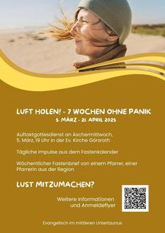 | 19:30 Uhr | Stille & Gebet im Ev. Gemeindehaus Görsroth |