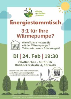 Beheizen Sie Ihr Haus bereits mit einer Wärmepumpe oder planen Sie den Umstieg? Dann sind Sie herzlich eingeladen zum offenen Energiestammtisch der Initiative Nachhaltiges Hünstetten e. V. (INaH) am Dienstag, 24. Februar, um 19:30 Uhr im s’Hoflädchen (GutStubb), Birkheckerstraße 4 in Görsroth. Auch Nicht-Mitglieder sind herzlich willkommen.