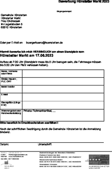 Bitte füllen Sie das Formular aus und senden es an buergerbuero@huenstetten.de. Gerne dürfen Sie dieses auch am Empfang der Gemeinde abgeben oder einfach per Briefpost an uns schicken. Natürlich dürfen Sie bis zum 17.05.2023 Ihre Anmeldung abgeben können, bedenken Sie aber, dass die Standplätze nach Reihenfolge des Eingangs vergeben werden.
