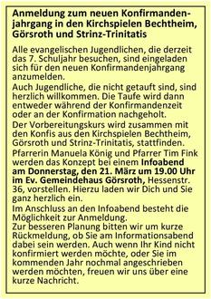 Pfarrerin Heilmann ist vom 5. bis 19. März im Urlaub. In pfarramtlichen Angelegenheiten wenden Sie sich bitte an Pfarrer Tim Fink in Bechtheim.