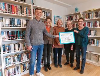 Von links: Erik Gallasch, Leitung Nesthäkchen und die Büchereimitarbeiterinnen Irmgard Pechtold, Ingrid Grund, Helga Fraund und Hilde Büttner-Roling