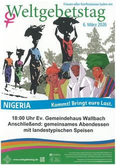 | 18:00 Uhr | Weltgebetstag der Frauen (Thema Nigeria) Ev. Gemeindehaus Wallbach |