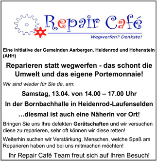 Am Samstag, 02.03. fand im Clubraum in Kettenbach erneut eine Repair-Cafe-Veranstaltung statt, nach langer, coronabedingter Pause zum ersten Mal wieder in Aarbergen. Diese von den Gemeinden Heidenrod, Hohenstein und Aarbergen durchgeführte Veranstaltung dient dem Bewahren von Gegenständen, die durch Reparatur weiterverwendet werden können. Leider ist das Reparieren aus der Mode gekommen. Die heutigen Gerätschaften sind auch nicht mehr sehr reparaturfreundlich. Das wird sich durch geplante Gesetzesänderungen in der Zukunft ändern - zum Vorteil der Umwelt und des eigenen Geldbeutels.