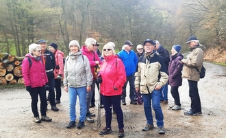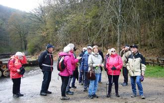 Regen ist gut für die Natur, aber nicht für Wanderer. An Wander-Donnerstagen hat es gefälligst zwischen 14.00 und 17.00 Uhr trocken zu sein, daran erinnerte am Donnerstag, dem 13. April eine Wanderin den Himmel, denn schließlich sind alle Teilnehmer des Wanderkreises der Wachstumsphase entwachsen und Begießen ist somit zwecklos. Bei leichtem Regen konnte der Wanderführer unter dem Vordach der Gemeindehalle im Oberdorf von Burg-Hohenstein immerhin noch 15 Wanderwillige begrüßen. Durch die ergiebigen Niederschläge vom Vortag und die Forstarbeiten im oberen Lahnerbachtal, wollte es der Wanderführer nicht riskieren, dass womöglich ein Wanderer im Schlamm steckenbleibt; bei der geringen Teilnehmerzahl ist Schwund nicht hinnehmbar. So stand nun heute als Alternative das untere Lahnerbachtal auf dem Programm. Als die kleine Gruppe am Schützenhaus vorbei gehend dem Radweg folgte, zeigte sich bereits am Horizont ein schmaler hellblauer Streifen - ein Lichtblick. Als der Abzweig auf der Höhe erreicht war, konnten die Schirme für den Rest der Tour zusammengeklappt werden, die Himmelsuhr ging also nur etwa 10 Minuten nach und wollte uns durchaus gutes Wanderwetter zukommen lassen.