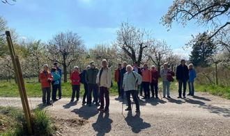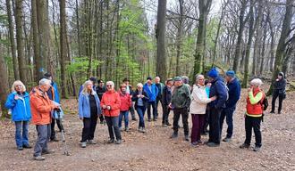 Um 14.00 Uhr konnte Horst 28 Wanderwillige vor Knopp’s Alm am Ortsrand Frauensteins begrüßen. Der Himmel war bedeckt und die Temperaturen fühlten sich im einstelligen Bereich recht frisch an. Die wenigen Meter dem Rheinsteig aufwärts folgend reichten kaum als Aufwärmphase aus, denn schon bald bewegte sich der Lindwurm ins Tal des Grorother Baches hinab. Spätestens jetzt bemerkte auch der letzte Wanderer, dass die Natur hier schon weiter fortgeschritten ist und an den Bäumen bereits viel Grün zu sehen ist. Dem trotz langer Trockenheit munter plätschernden Bächlein mal links und dann rechts talaufwärts folgend fiel den Wanderern der unaufgeräumte Wald auf. Die Bemerkung einiger Betrachter: „Das sieht ja wie ein Urwald aus!“ hätte die Befürworter der Maßnahme sicher erfreut. Nach dem wilden Areal lenkte eine Waldwiese die Blicke auf sich. Ein Halt bei einem Querweg sorgte für eine kurze Verschnaufpause und dann wurden die vorerst letzten, die Muskelmotoren beanspruchenden Höhenmeter hinauf zum Parkplatz „Monstranzenbaum“ erklommen. Der mit seiner Gabelung an eine Monstranz erinnernde Baumveteran liegt nun aus Sicherheitsgründen niedergelegt abseits des Platzes. Interessierte konnten die Geschichte, welche sich um den Baum rankt, auf einer Hinweistafel lesen und außerdem war es eine willkommene Pause zum Durchatmen. Die Bedeutung der Holztafeln mit den Zahlenangaben wurde erklärt und auf einem Pfad parallel zur Straße nach Georgenborn lief die Gruppe zu einem zwischen den Buchen wie eine riesige Echse aus dem Boden herausragenden Felsriegel. Nahe dem Grauen Stein verließ die Wandergruppe den Rheinsteig, überquerte die Autostraße und strebte nun mit flottem Schritt dem Tal des Lippbaches zu. Langjährige Mitwanderer im Hohensteiner Wanderkreis erinnerten sich sogar, dass wir hier schon einmal dem mit einem schwarzen Punkt markierten Wanderweg nach Frauenstein gefolgt waren. Das frische hellgrüne Laub an den Bäumen und der Bewuchs an den Wegkanten machten deutlich, dass wir uns dem klimatisch begünstigten Rheintal näherten. Unmittelbar nach Verlassen des Waldes sahen die Augen der Wanderer auf ein Meer weißer Blüten. Die Blütenpracht hatte sich voll entfaltet und offenbar bislang keinen Schaden an den kühlen Nächten genommen. Damit der Eindruck perfekt wurde, hatte der Himmel die Wolken beiseite geschoben und so wirkte der Kontrast der weißen Kirschblüten unter dem Blau des Firmaments besonders eindrucksvoll. An den Plantagen mit den blühenden Bäumen entlang lief die Gruppe nach Frauenstein. Am Sportplatz vorbei strebten die Wanderer nun immer noch der genannten Markierung folgend in Richtung Goethestein. Dort auf einer Bank sitzend warteten vier Wandersleute, welche sich Hildegard zu einer kürzeren Wanderung nahe des Nürnberger Hofes angeschlossen hatten. Die Freude war groß und die Kurzstreckler berichteten nicht nur von der Quarzklippe, bei der sie längs spaziert waren, sondern auch von einem Blühwunder. Auf einem Kirschbaum hatte man wohl einige Reiser einer rosa blühenden (Zier-)kirsche aufgepfropft und so für das Farbenspiel gesorgt. Nach der freudigen Begegnung führte Horst die Wanderer am Nürnberger Hof vorbei und unterhalb des gut sichtbaren Goethesteins und der Quarzklippe zu einem Pfädchen, das den Abstieg ins Tal zum Ort Frauenstein ermöglichte. Das Zeichen des Rheinsteigs lenkte die Wanderer bis in die Nähe des Friedhofes. Hier entschied man sich für eine direktere Wegvariante zur Erreichung von Knopp’s Alm. Den Nebenraum des Lokals hatte der Wirt für die Hohensteiner Wanderer reserviert und bald erfüllte den Raum ein geräuschvolles Geplauder. Wenn 30 Wanderfreunde, die sich zur Einkehr entschlossen hatten, munter schwatzen, dann summt es schon ganz ordentlich. Das schöne Wetter und der Blütenrausch hatten zu einem besonderen Wandererlebnis geführt, darin waren sich alle einig.