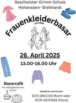 Der Basar für Frühjahrs-/Sommerbekleidung in der Geschwister-Grimm-Schule in Breithardt findet am Samstag, 26.04. statt. Interessierte Käufer können von 13.00 - 16.00 Uhr gemütlich einkaufen und im Basar Café wieder selbstgebackene Kuchen genießen.