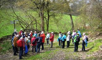 Das Wetter passte und so fanden sich am Donnerstag, 27. April, 32 Wanderwillige in Wisper vor der Hexenmühle ein, wobei viele der Erschienenen bestätigten, dass sie bisher den Oberlauf der Wisper noch nicht kennen. Die Wanderung begann auf der Zufahrt zum Wispersee, wo mit der ersten Begegnung des hier schon recht munteren Bächleins der tiefste Geländepunkt erreicht war. Verschiedene Trails treffen sich hier und der Wanderführer hatte für die Hohensteiner Gruppe den Weg mit der Bezeichnung „Wispergeflüster“ ausgesucht. Auf diesem Weg dem Bachlauf folgend, kam der Ausgangsort von der Talseite ins Blickfeld.
