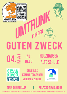 Am Samstag, 04. Mai findet ab 16.00 Uhr in der Alten Schule Holzhausen ü.A. ein „Umtrunk für den guten Zweck“ statt. Hier warten Snacks, frisch Gezapftes und alkoholfreie Getränke auf Euch. Alle Einnahmen werden dem „Clean River Projekt“ und der „Initiative für Strassentiere“ gespendet. Beide Teams werden mit Ihren Fahrzeugen vor Ort sein und -neben dem Ausschank- gerne über das Projekt berichten. Bringt Aufkleber Eurer Vereine, Firmen oder Projekte mit. Gegen Spenden werden Sie auf den Rallye-Fahrzeugen angebracht!