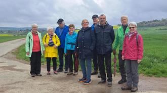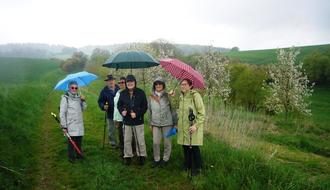 Ein Tief mit ergiebigem Regen sollte just am Donnerstag, dem 24. April unser Land überqueren. Diese Wetterprognosen ließen erwarten, dass nur die „Allwetter-Wanderer“ am ausgemachten Treffpunkt in Holzhausen bei der Gemeindehalle erscheinen würden. Was allerdings keine APP auf dem Schirm hatte, war die Tatsache, dass es auch aus dem Brummschädel des Wanderführers ergiebig tröpfelte und seine Laufwerkzeuge eine ungewohnte Elastizität aufwiesen. Das waren Gründe, sich nach einem Ersatz zur Führung der Wanderwilligen umzusehen. In Ermangelung eines Ortskundigen erklärte sich Rolf aus Strinz bereit die Gruppe, es waren immerhin 10 Wetterfeste erschienen, zu führen. Während diese Gruppe um 14 Uhr gestartet war und rund 8 km Strecke ablief, hatte Hildegard eine 3 – 4 km lange Tour mit Abmarsch um 15.00 Uhr angeboten und es waren auch hier dem drohenden Gewölk zum Trotz 7 Wanderfreunde am Treffpunkt erschienen.