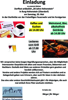 Seit Beginn der Feierlichkeiten im letzten Jahr, wurde bereits schon in einigen Ortsteilen gefeiert. Die Gemeinde Hohenstein bietet nun zum Abschluss der Feierlichkeiten ein buntes Programm für alle an. Freitags findet die große Mallorca-Party mit den Mallorca-Stars „Ikke Hüftgold“, „DJ Düse“, „Dorfkind“ und „DJ Marv“ statt. Samstags gibt es einen Rummel für die Kinder, abends spielt die beliebte Partyband „Familie Hossa“.