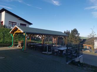 Nach umfassender Planung begannen im Oktober 2021 die Tiefbauarbeiten zur Vergrößerung des Vorplatzes am Gerätehaus Breithardt. Hierzu musste unter anderem der Abhang am Parkplatz aufgeschüttet werden. Nach einer Baupause im Winter konnte die neugewonnene Fläche im Frühjahr gepflastert und Fundamente gegossen werden. Sämtliche Arbeiten wurden von den Ehrenamtlichen in Eigenleistung und mit großer Hingabe durchgeführt. Im Sommer 2022 folgte schließlich der Aufbau der Grillhütte samt Dachverschalung. Auch hier verbrachte man im Vorhinein etliche Stunden mit vorbereitenden Arbeiten an den Holzbalken. Abgerundet wurde der neue Bau durch die Anschaffung von nachhaltigen, wetterfesten Sitzgarnituren.