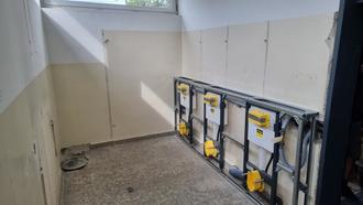 In den letzten Wochen wurden bereits die Sanitärhinterwandinstallationen durchgeführt. Dabei wurden zunächst die bestehenden Installationen aus den 70er Jahren abgerissen und die Anschlüsse für die Toiletten, Pissoirs und Waschbecken erneuert. Am vergangenen Dienstag wurde mit den Fliesenarbeiten begonnen. Die neue Toilettenanlage soll optisch ansprechend und funktional gestaltet werden. Parallel werden Elektroarbeiten für die Beleuchtung, Steckdosen und eventuelle technische Ausstattung der Toiletten durchgeführt. Nach Abschluss der Hauptarbeiten sind Malerarbeiten notwendig, um die Innenräume in neuem Glanz erstrahlen zu lassen.