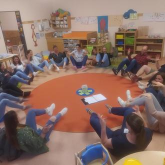 Hintergrund dieses etwas anderen Elternabends war die lange Pandemiezeit mit Betretungsverbot für die Eltern. Viele Eltern hatten an diesem Abend die Gelegenheit in die Gruppen und Aktionsräume der Kita zu schnuppern. Das Kita Team bedankt sich bei allen Eltern die an diesem Abend Interesse zeigten und anwesend waren! Die Eltern meldeten nur positive Eindrücke zurück und einige hatten u.a. sichtlich Freude an dem improvisierten „Morgenkreis“ mit lustigen Spielen zum Ende der Veranstaltung, siehe Foto.