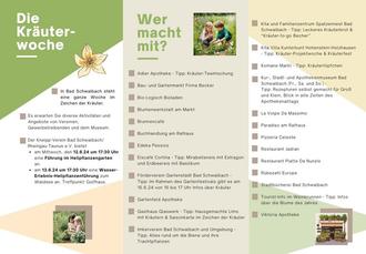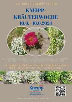In Bad Schwalbach steht ab dem 10. Juni eine ganze Woche im Zeichen der Kräuter. Es erwarten Sie diverse Aktivitäten und Angebote von Vereinen, Gewerbetreibenden und dem Museum. Der Kneipp-Verein Bad Schwalbach/ Rheingau-Taunus e.V. bietet im Rahmen der Kräuterwoche zwei Führungen an: Am Mittwoch, den 12. Juni um 17.30 Uhr gibt es eine Führung im Heilpflanzengarten und am 13. Juni um 17.30 Uhr eine Wasser-Erlebnis-Heilpflanzenführung zum Waldsee.