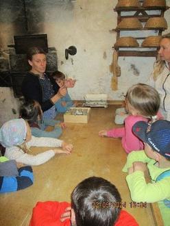 Die anschließende Führung mit der „historischen Hausfrau“, verkörpert durch Iris von Stephanitz erzählte uns, wie die Menschen früher „vom Korn zum Brot kamen“. Die Kinder durften sogar in die, für Besucher sonst abgesperrten Bereiche einiger Häuser, um zu sehen, wo das Brot gelagert wurde, nämlich im Schlafzimmer, da es dort am kühlsten war. Im alten Backhaus waren die Kinder vor allem von dem Ofen fasziniert, in dem 50 Brote auf einmal gebacken werden konnten. Der Abschluss der Führung wurde mit der Besichtigung einer Kappenwindmühle gekrönt, vor der Höhe und dem großen Kammrad im Inneren der Mühle hatten die Kinder sichtlich Respekt.